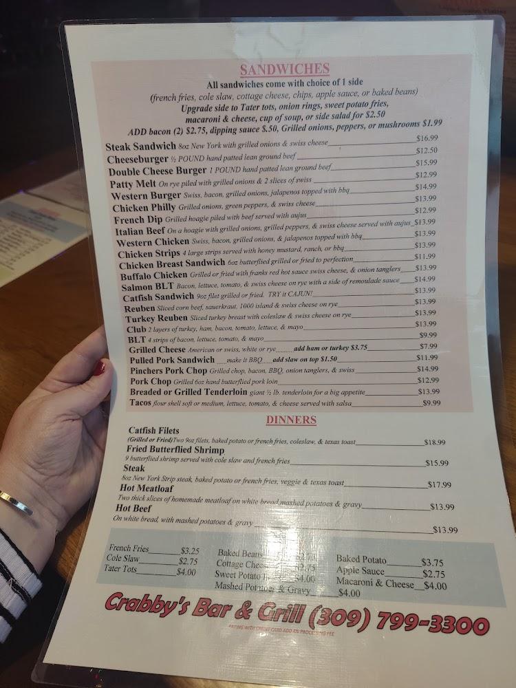 Welcome to Crabby's Bar & Grill, your go-to destination in Coal Valley for a casual dining experience that delights. Located at 826 W 1st Ave, we pride ourselves on our excellent selection of cocktails and a vast array of beers, all served in a relaxed atmosphere perfect for families and groups. Enjoy our signature grill dishes available for dine-in, takeout, or delivery, and don't miss our lively entertainment, including karaoke and live music. With accessible amenities and a cozy fireplace, Crabby's is ideal for lunch, dinner, or a night out. Join us for happy hour and savor a taste of tradition in every bite!